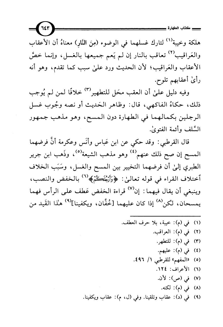 قال القرطبي: وقد حكي عن ابن عَباس وأنَس وعكرمة أنَّ فرضهما المسح إن صح ذلك عنهم (¬4) وهو مذهب الشيعة (¬5)، وذَهب ابن جرير الطبري إلى أن فرضهما التخيير بين المسح والغسل، وسَبَب الخلاف اختلاف القراء في قوله تعالى: {وَأَرْجُلَكُمْ} (¬6) بالخفض والنصب، وينبغي أن يقال فيهما: إن (¬7) قراءة الخفض عَطف على الرأس فهما يمسحان، لكن (¬8) إذا كان عليهما [خُفَّان، ويكفينا] (¬9) هذا القَيد من