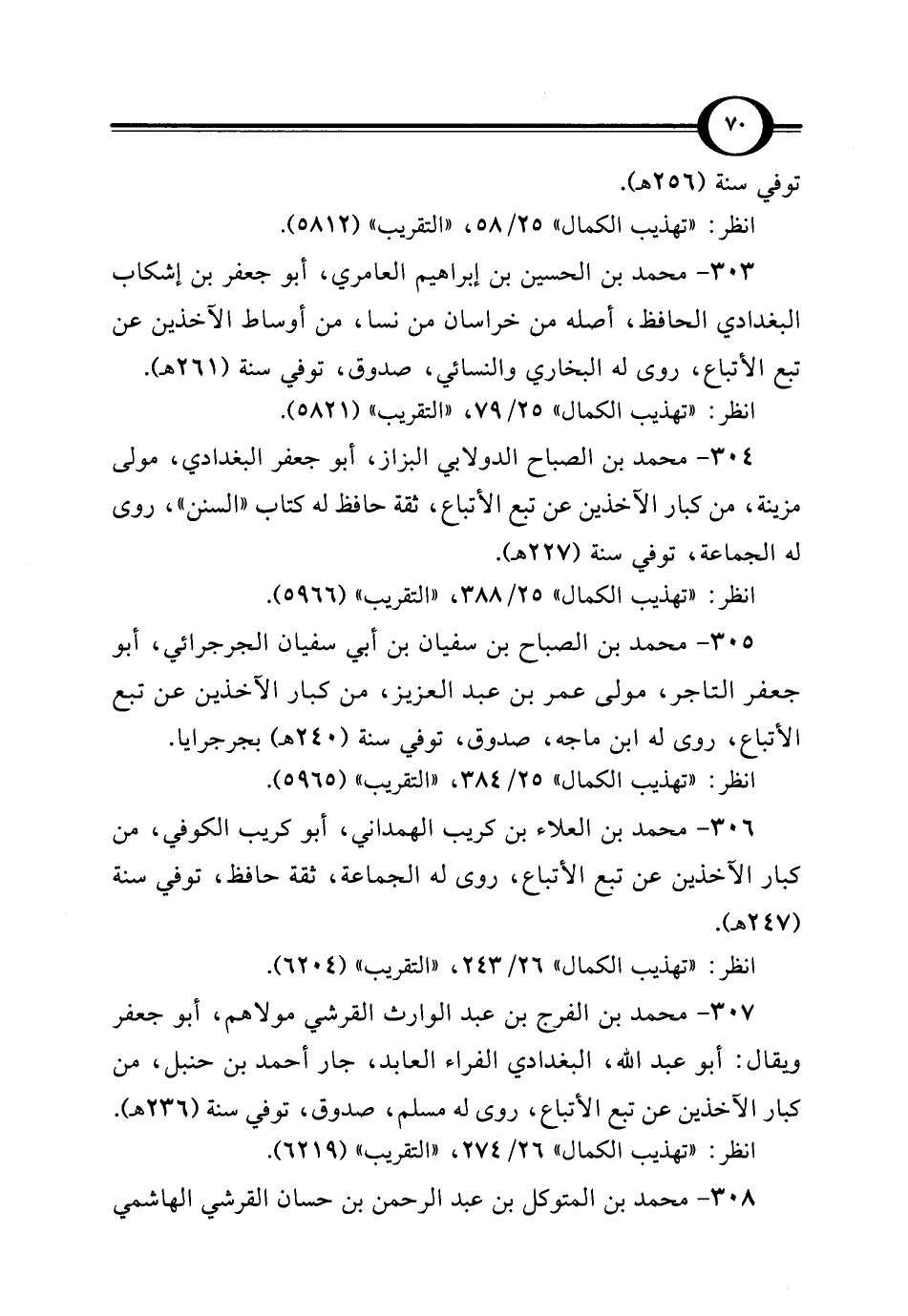 303 - محمَّد بن الحسين بن إبراهيم العامري، أبو جعفر بن إشكاب البغدادي الحافظ، أصله من خراسان من نسا، من أوساط الآخذين عن تبع الأتباع، روى له البخاري والنسائيُّ، صدوق، توفي سنة (261 هـ).