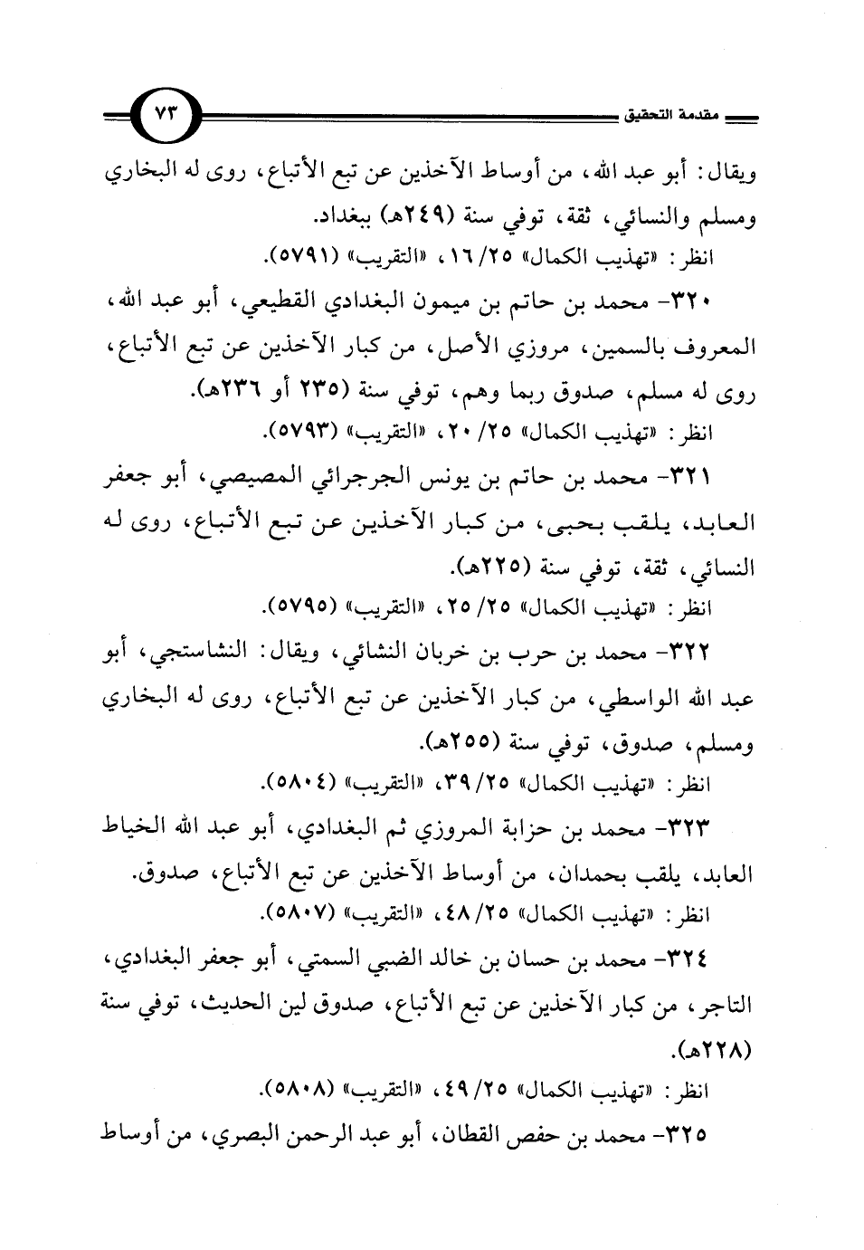 321 - محمَّد بن حاتم بن يونس الجرجرائي المصيصي، أبو جعفر العابد، يلقب بحبى، من كبار الآخذين عن تبع الأتباع، روى له النسائي، ثقة، توفي سنة (225 هـ).