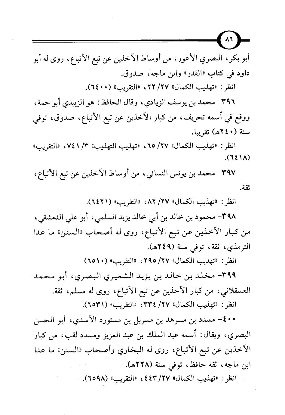 396 - محمَّد بن يوسف الزيادي، وقال الحافظ: هو الزبيدي أبو حمة، ووقع في اسمه تحريف، من كبار الآخذين عن تبع الأتباع، صدوق، توفي سنة (240 هـ) تقريبا.