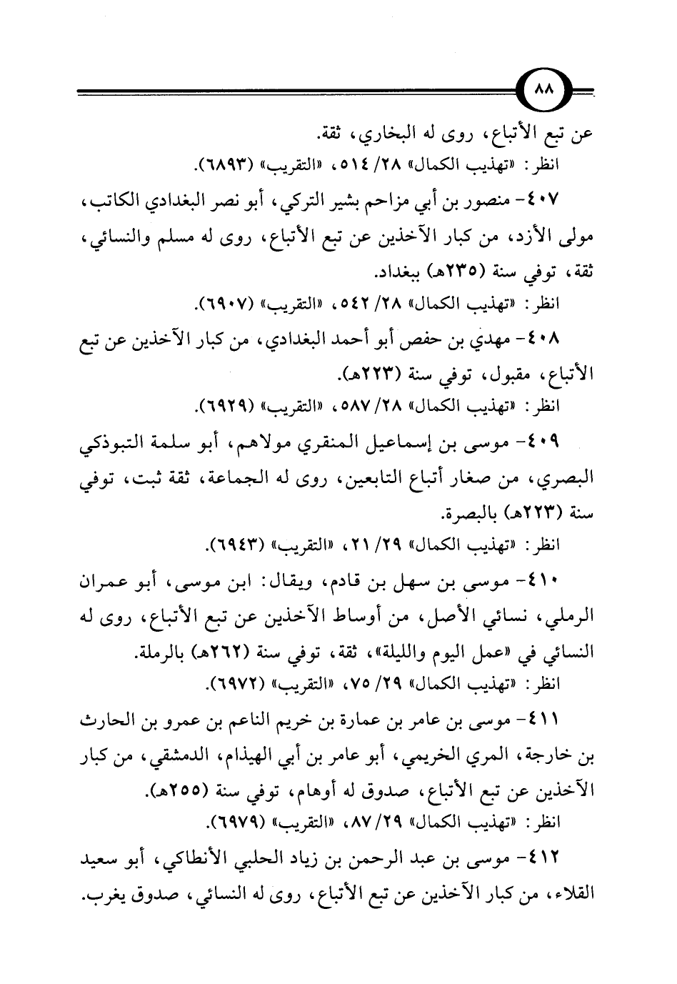 409 - موسى بن إسماعيل المنقري مولاهم، أبو سلمة التبوذكي البصري، من صغار أتباع التابعين، روى له الجماعة، ثقة ثبت، توفي سنة (223 هـ) بالبصرة.