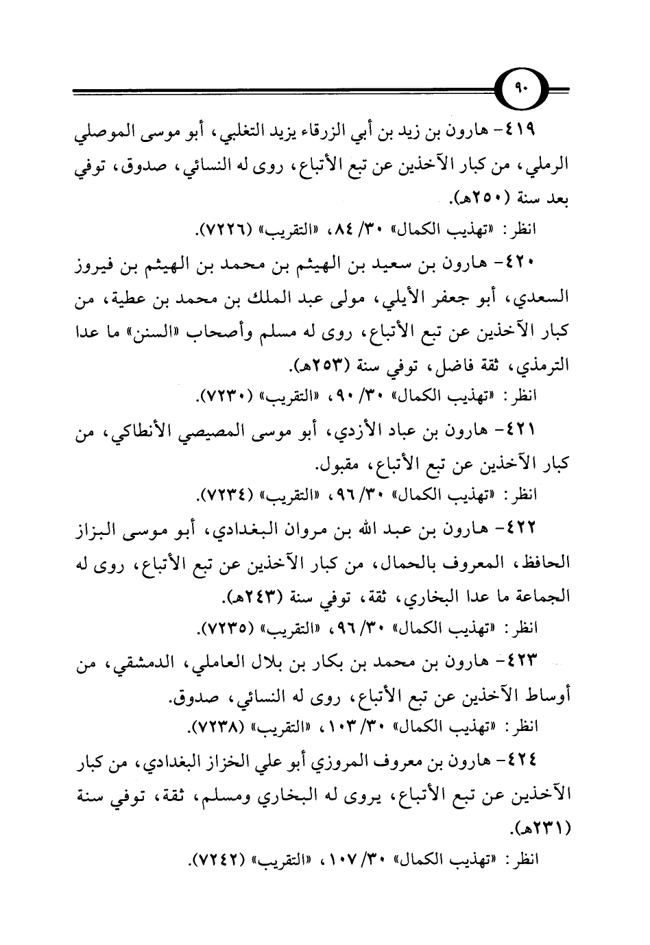 419 - هارون بن زيد بن أبي الزرقاء يزيد التغلبي، أبو موسى الموصلي الرملي، من كبار الآخذين عن تبع الأتباع، روى له النسائي، صدوق، توفي بعد سنة (250 هـ).