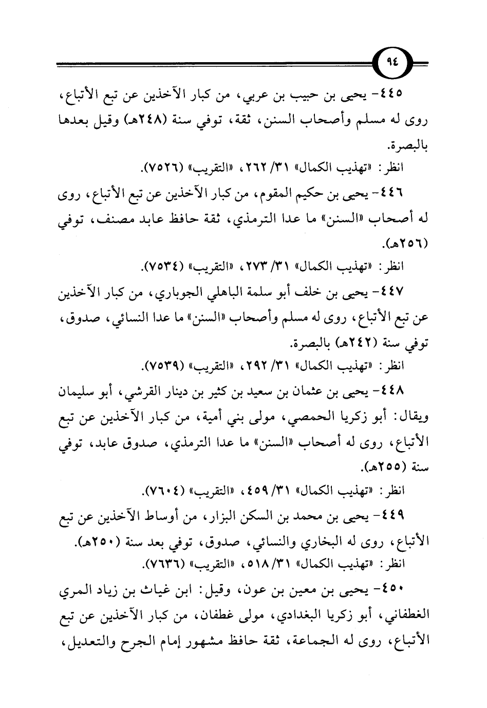 450 - يحيى بن معين بن عون، وقيل: ابن غياث بن زياد المري الغطفاني، أبو زكريا البغدادي، مولى غطفان، من كبار الآخذين عن تبع الأتباع، روى له الجماعة، ثقة حافظ مشهور إمام الجرح والتعديل،