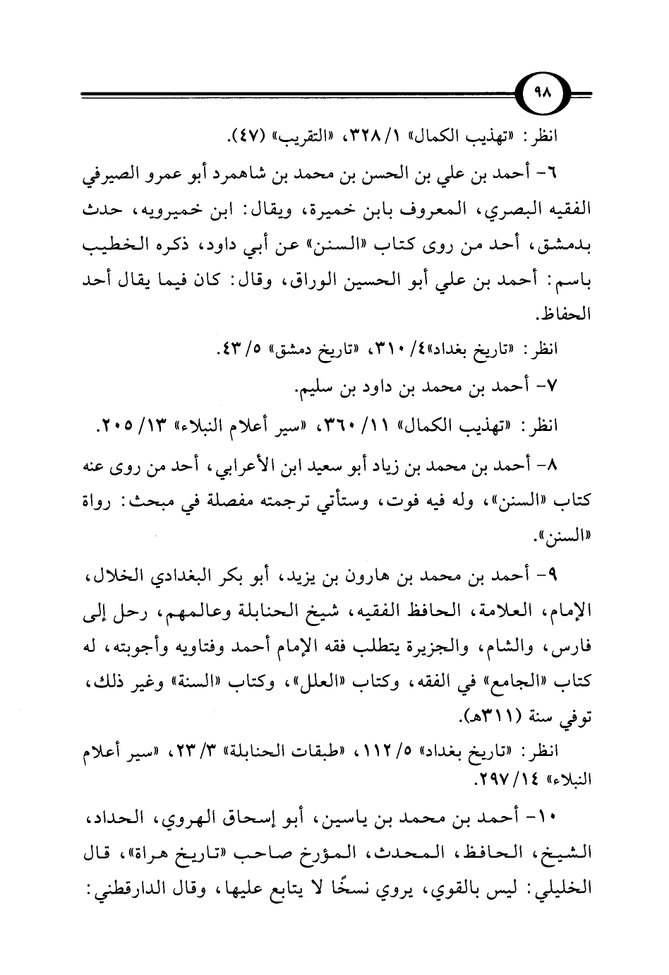 9 - أحمد بن محمَّد بن هارون بن يزيد، أبو بكر البغدادي الخلال، الإمام، العلامة، الحافظ الفقيه، شيخ الحنابلة وعالمهم، رحل إلى فارس، والشام، والجزيرة يتطلب فقه الإمام أحمد وفتاويه وأجوبته، له كتاب "الجامع" في الفقه، وكتاب "العلل"، وكتاب "السنة" وغير ذلك، توفي سنة (311 هـ).