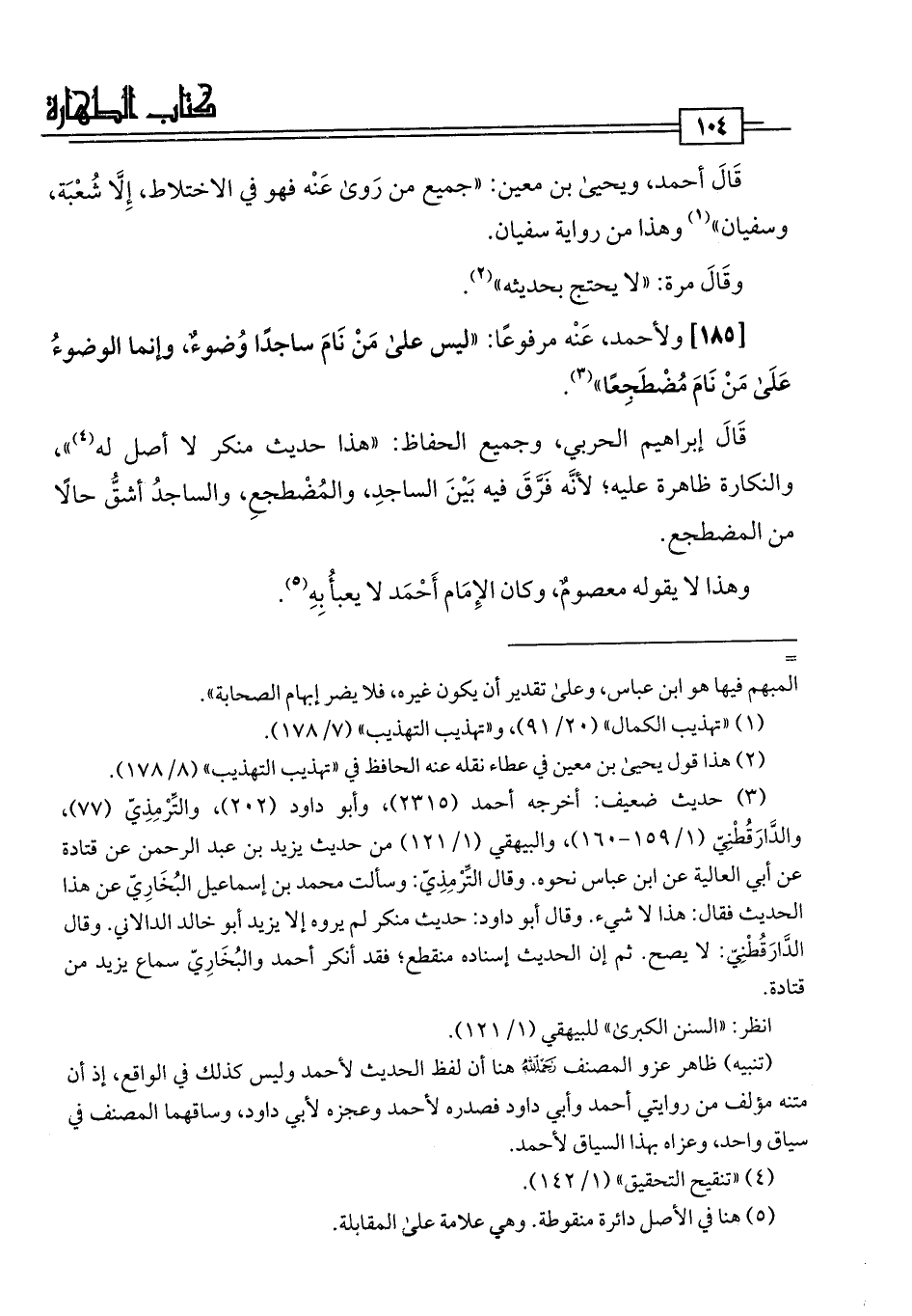 [185] ولأحمد، عَنْه مرفوعًا: "ليس على مَنْ نَامَ ساجدًا وُضوءٌ، وإنما الوضوءُ عَلَى مَنْ نَامَ مُضْطَجِعًا" (¬3).