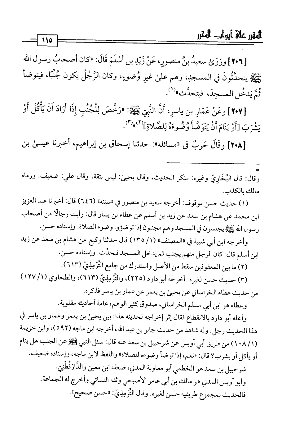 [206] ورَوَى سعيدُ بنُ منصورٍ، عَنْ زَيْدِ بن أسْلَمَ قَالَ: "كَان أصحابُ رسول اللَّه -صلى اللَّه عليه وسلم- يتحدَّثُونَ في المسجدِ، وهم على غيرِ وُضوءٍ، وكان الرَّجُلُ يكون جُنُبًا، فيتوضأ ثُمَّ يَدخُل المسجِدَ، فيتحدَّث" (¬1).
