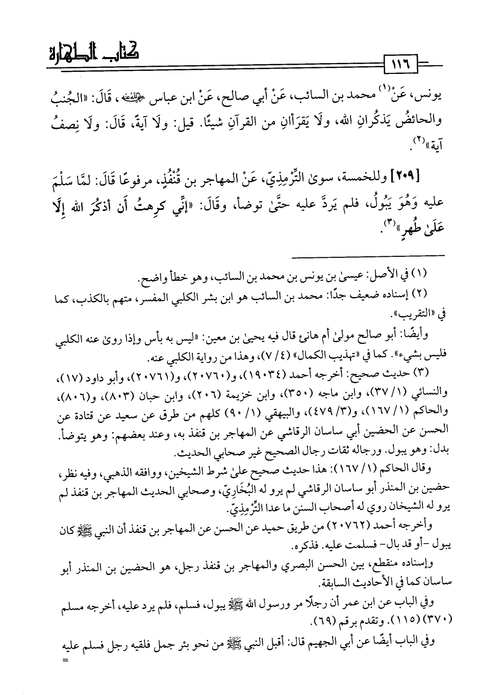 [209] وللخمسة، سوى التِّرْمِذِيّ، عَنْ المهاجر بن قُنْفُذٍ، مرفوعًا قَالَ: لمَّا سَلْمَ عليه وَهُوَ يَبُولُ، فلم يَردَّ عليه حتَّى توضأ، وقَالَ: "إنِّي كرِهتُ أَن أذكُرَ اللَّه إِلَّا عَلَى طُهرٍ" (¬3).