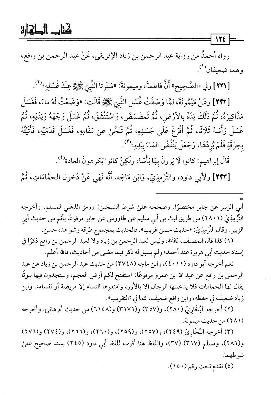 [233] ولأبي داود، والتِّرْمِذِيّ، وَابْن مَاجَه، أَنَّه نَهَي عَنْ دُخول الحمَّامَاتِ، ثُمَّ