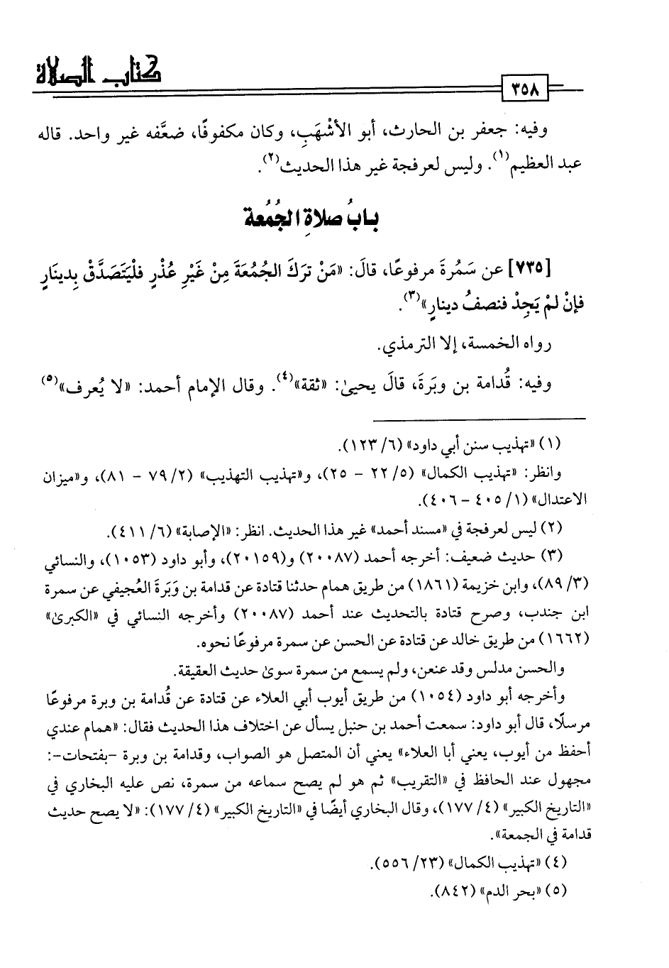 [735] عن سَمُرةَ مرفوعًا، قَالَ: "مَنْ تَرَكَ الجُمُعَةَ مِنْ غَيْرِ عُذْرٍ فلْيَتَصَدَّقْ بِدينَارٍ فإنْ لمْ يَجِدْ فنصفُ دينارٍ" (¬3).