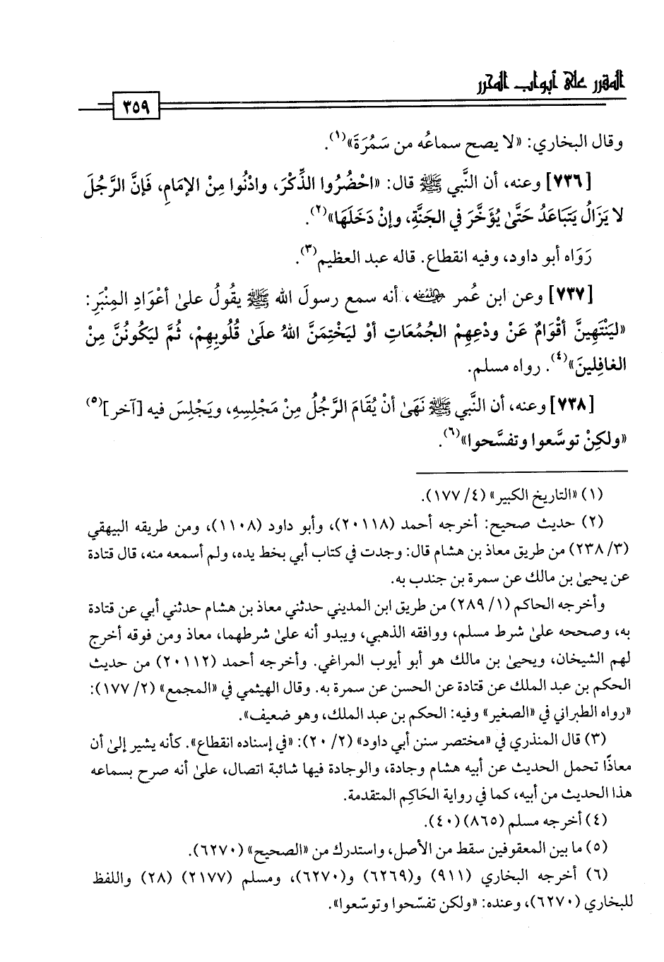 [736] وعنه، أن النَّبي -صلى اللَّه عليه وسلم- قال: "احْضُرُوا الذِّكْرَ، وادْنُوا مِنْ الإمَامِ، فَإنَّ الرَّجُلَ لا يَزَالُ يَتبَاعَدُ حَتَّى يُؤَخَّرَ في الجَنَّةِ، وإنْ دَخَلَهَا" (¬2).