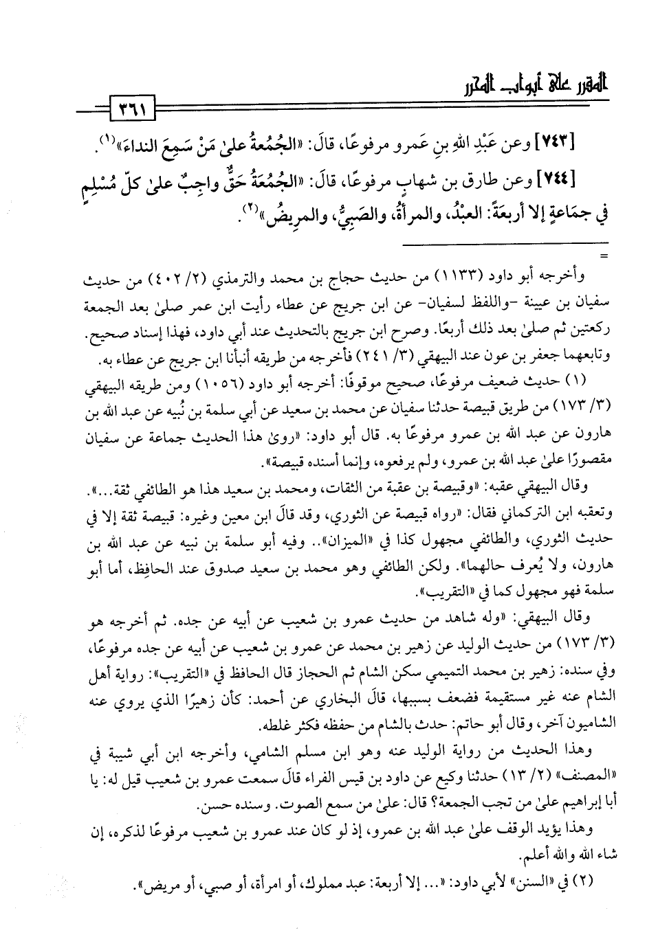 [744] وعن طارق بن شهابٍ مرفوعًا، قَالَ: "الجُمُعَةُ حَقٌّ واجِبٌ على كلّ مُسْلِمٍ في جمَاعةٍ إلا أربعَةً: العبْدُ، والمرأةُ، والصَبِيُّ، والمرِيضُ" (¬2).