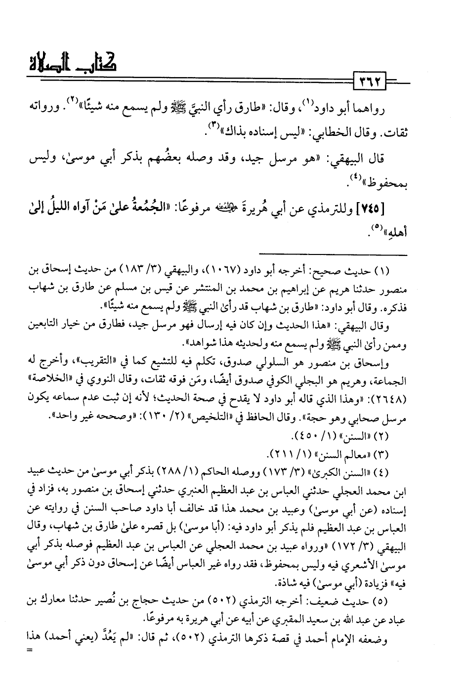 رواهما أبو داود (¬1)، وقال: "طارق رأي النبيَّ -صلى اللَّه عليه وسلم- ولم يسمع منه شيئًا" (¬2). ورواته ثقات. وقال الخطابي: "ليس إسناده بذاك" (¬3).