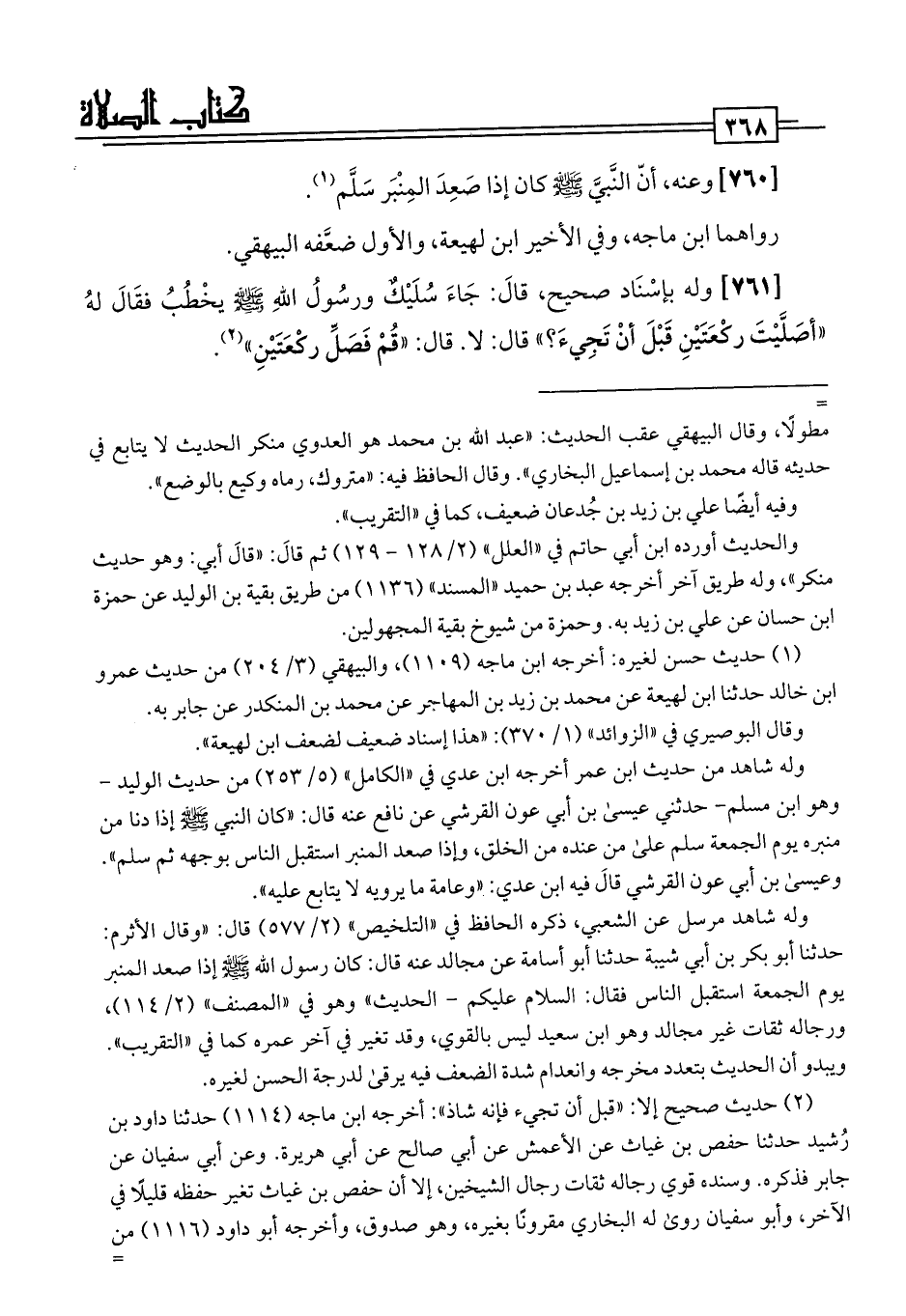 [760] وعنه، أنّ النَّبيَّ -صلى اللَّه عليه وسلم- كان إذا صَعِدَ المِنْبَر سَلَّم (¬1).