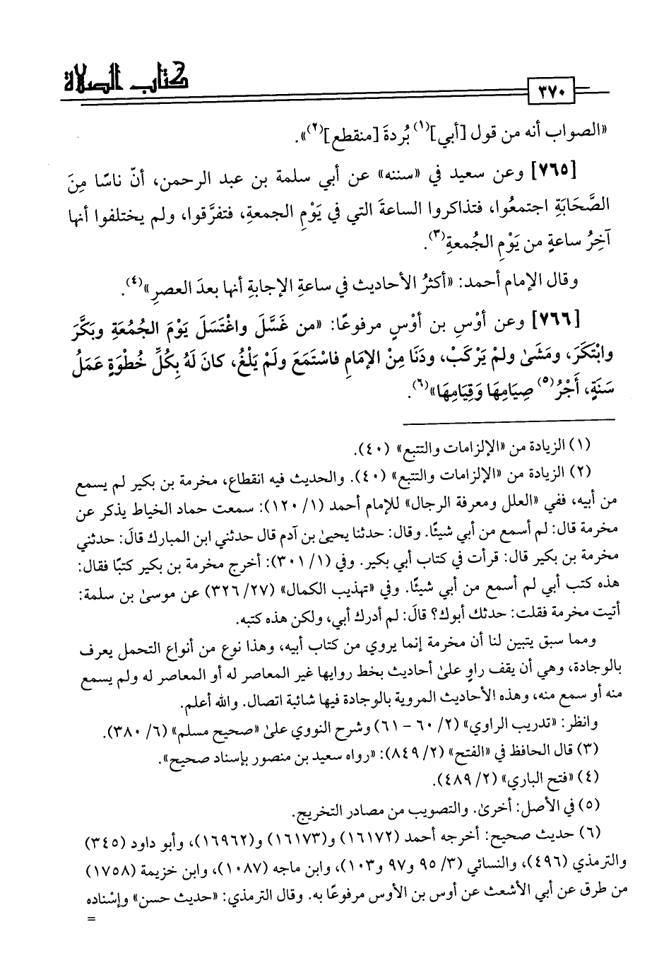 [765] وعن سعيد في "سننه" عن أبي سلمة بن عبد الرحمن، أنّ ناسًا مِنَ الصَّحَابَةِ اجتمعُوا، فتذاكروا الساعةَ التي في يَوْمِ الجمعةِ، فتفرَّقوا، ولم يختلفوا أنها آخِرُ ساعةٍ من يَوْمِ الجُمعةِ (¬3).