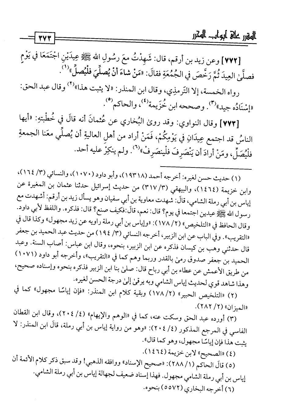 [772] وعن زيد بن أرقم، قال: شَهِدْتُ معَ رسُولِ اللَّه -صلى اللَّه عليه وسلم- عِيدَيْنِ اجْتَمَعَا في يَوْمٍ فصلَّى العِيدَ ثُمَّ رَخَّصَ في الجُمُعَةِ فقالَ: "مَنْ شاءَ أنْ يُصلِّيَ فلْيُصلِّ" (¬1).