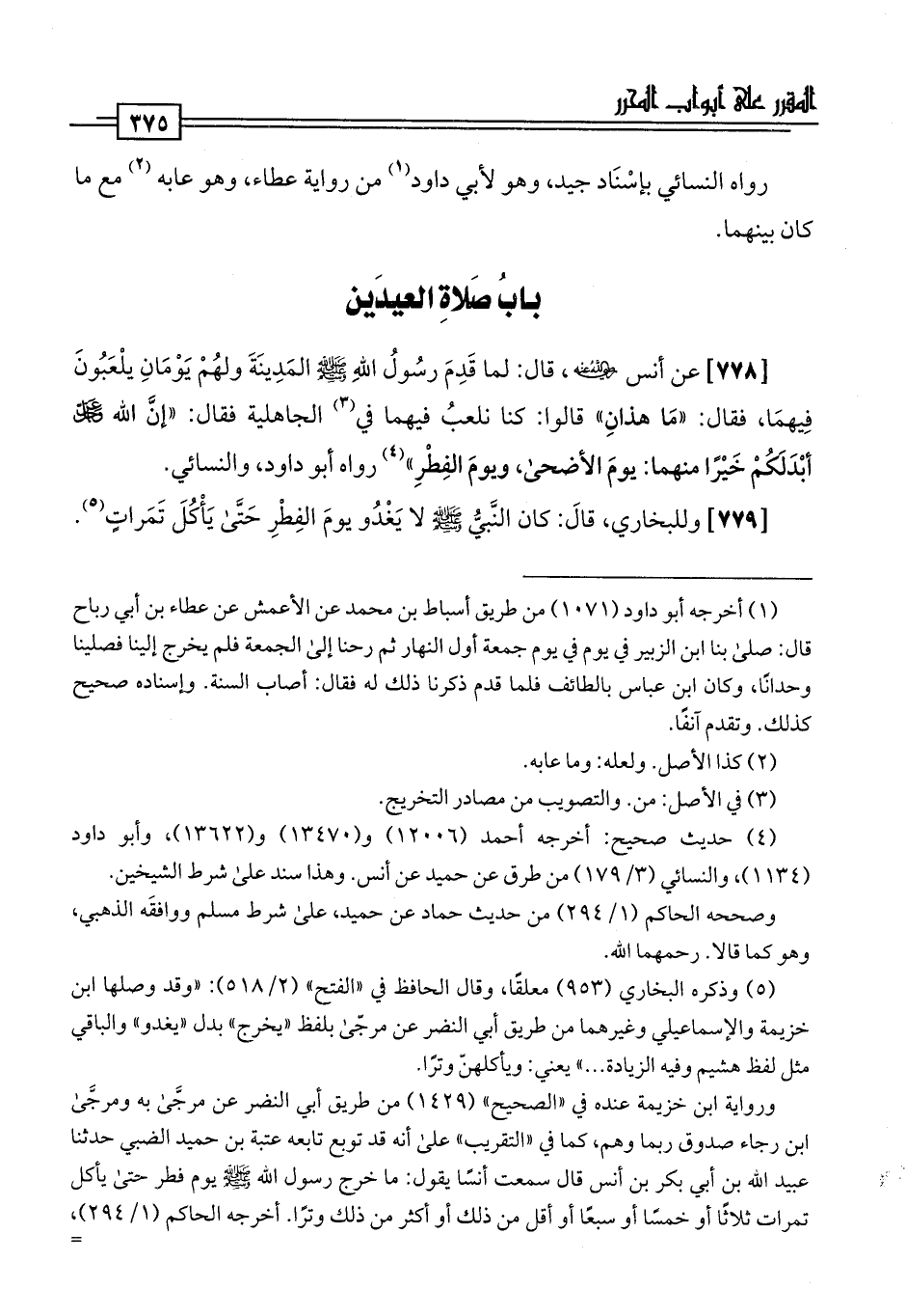 [778] عن أنس -رضي اللَّه عنه-، قال: لما قَدِمَ رسُولُ اللَّهِ -صلى اللَّه عليه وسلم- المَدِينَةَ ولهُمْ يَوْمَانِ يلْعَبُونَ فِيهمَا، فقال: "مَا هذانِ" قالوا: كنا نلعبُ فيهما في (¬3) الجاهلية فقال: "إنَّ اللَّه عز وجل أبْدَلَكُمْ خَيْرًا منهما: يومَ الأضحى، ويومَ الفِطرِ" (¬4) رواه أبو داود، والنسائي.