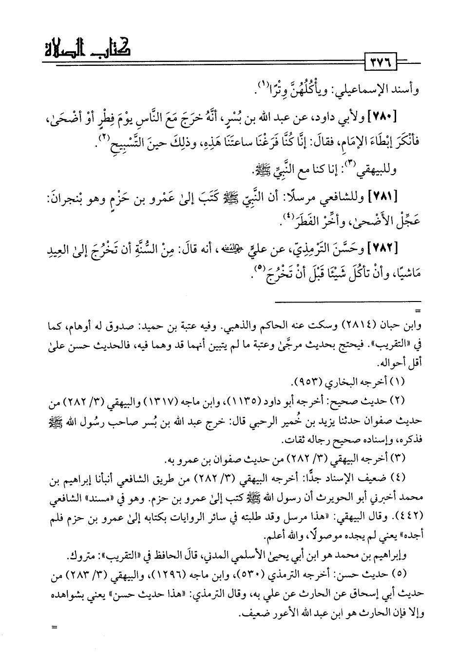 [782] وحَسَّنَ التَرْمِذِيّ، عن عليٍّ -رضي اللَّه عنه-، أنه قَالَ: مِنْ السُّنَّةِ أن تَخْرُجَ إلى العِيدِ مَاشيًا، وأنْ تأكُلَ شَيْئًا قَبْلَ أنْ تَخْرُجَ (¬5).