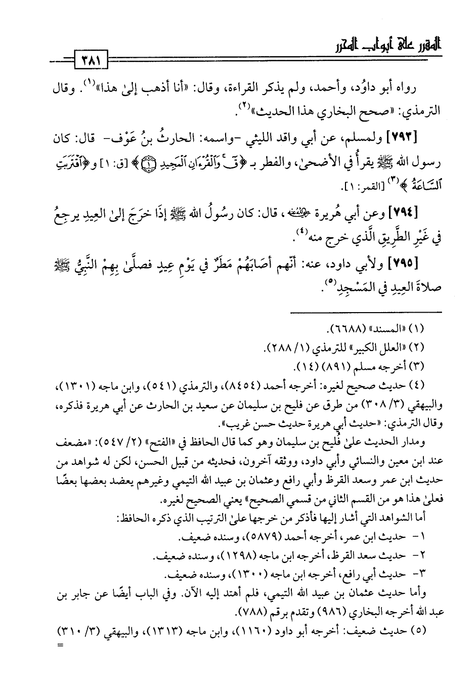 [793] ولمسلم، عن أبي واقد الليثي -واسمه: الحارثُ بن عَوْف- قال: كان رسول اللَّه -صلى اللَّه عليه وسلم- يقرأُ في الأضحى، والفطر بـ {ق وَالْقُرْآنِ الْمَجِيدِ (1)} [ق: 1] و {اقْتَرَبَتِ السَّاعَةُ} (¬3) [القمر: 1].