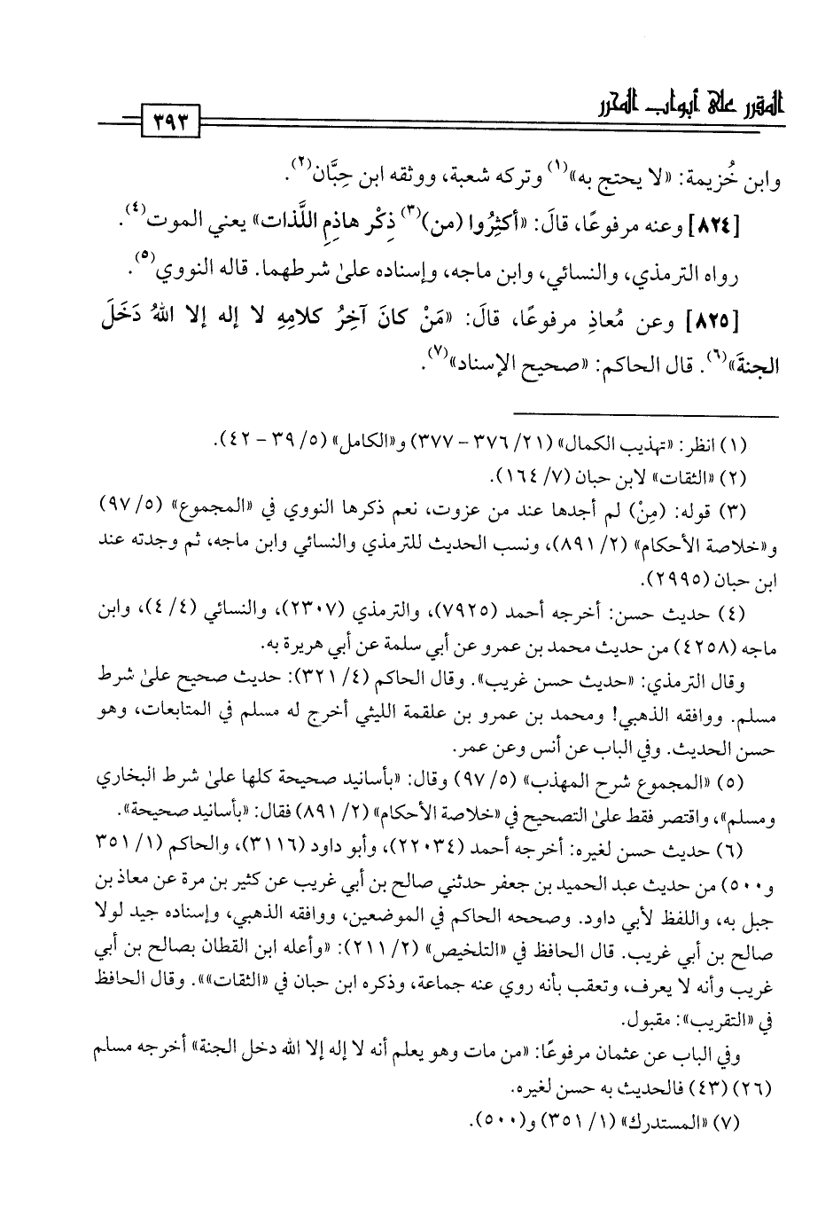 [825] وعن مُعاذِ مرفوعًا، قَالَ: "مَنْ كَانَ آخِرُ كلامِهِ لا إله إلا اللَّهُ دَخَلَ الجنةَ" (¬6). قال الحاكم: "صحيح الإسناد" (¬7).