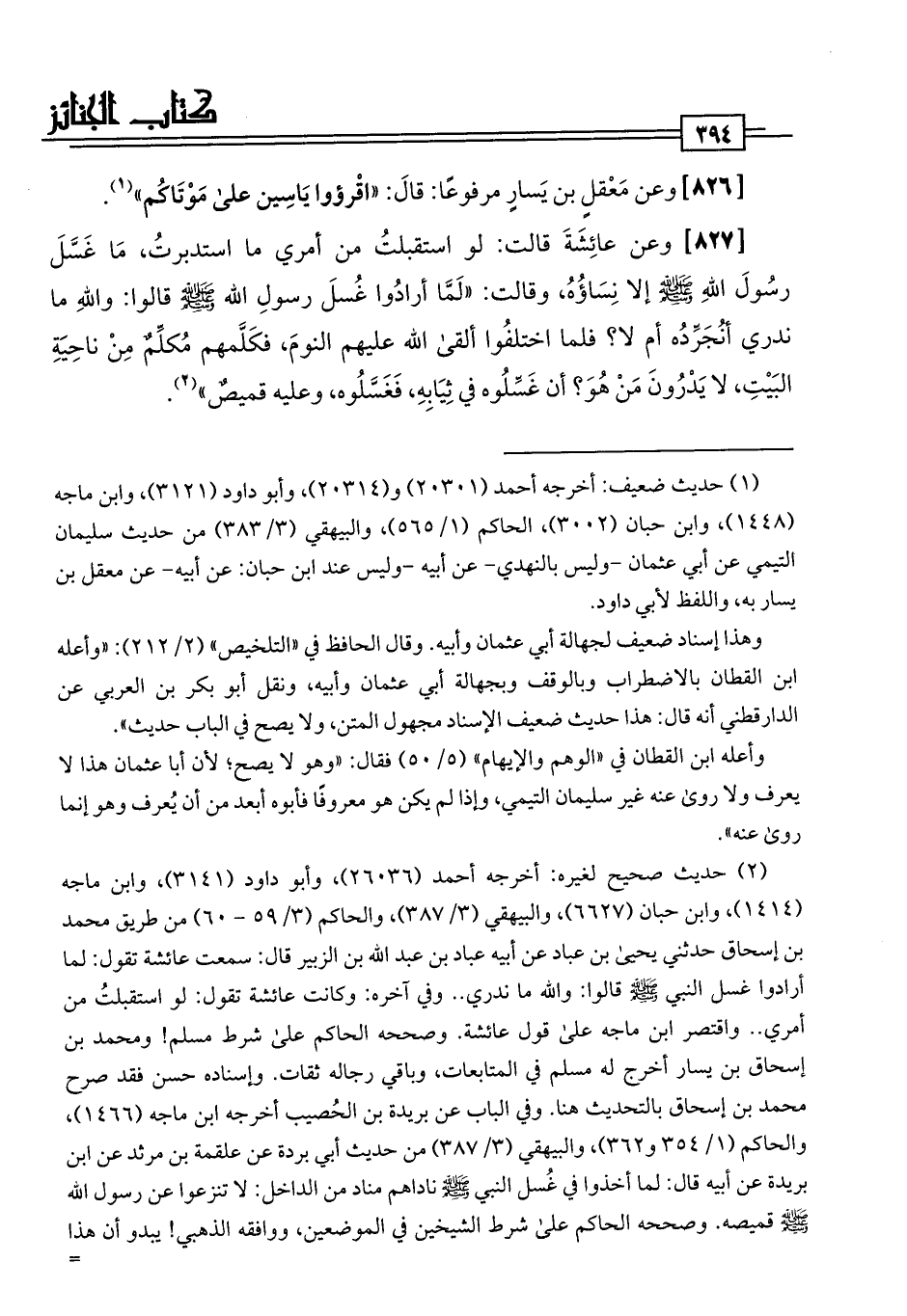 [826] وعن مَعْقلٍ بن يَسارٍ مرفوعًا: قَالَ: "اقْرؤوا يَاسِين على مَوْتَاكُم" (¬1).