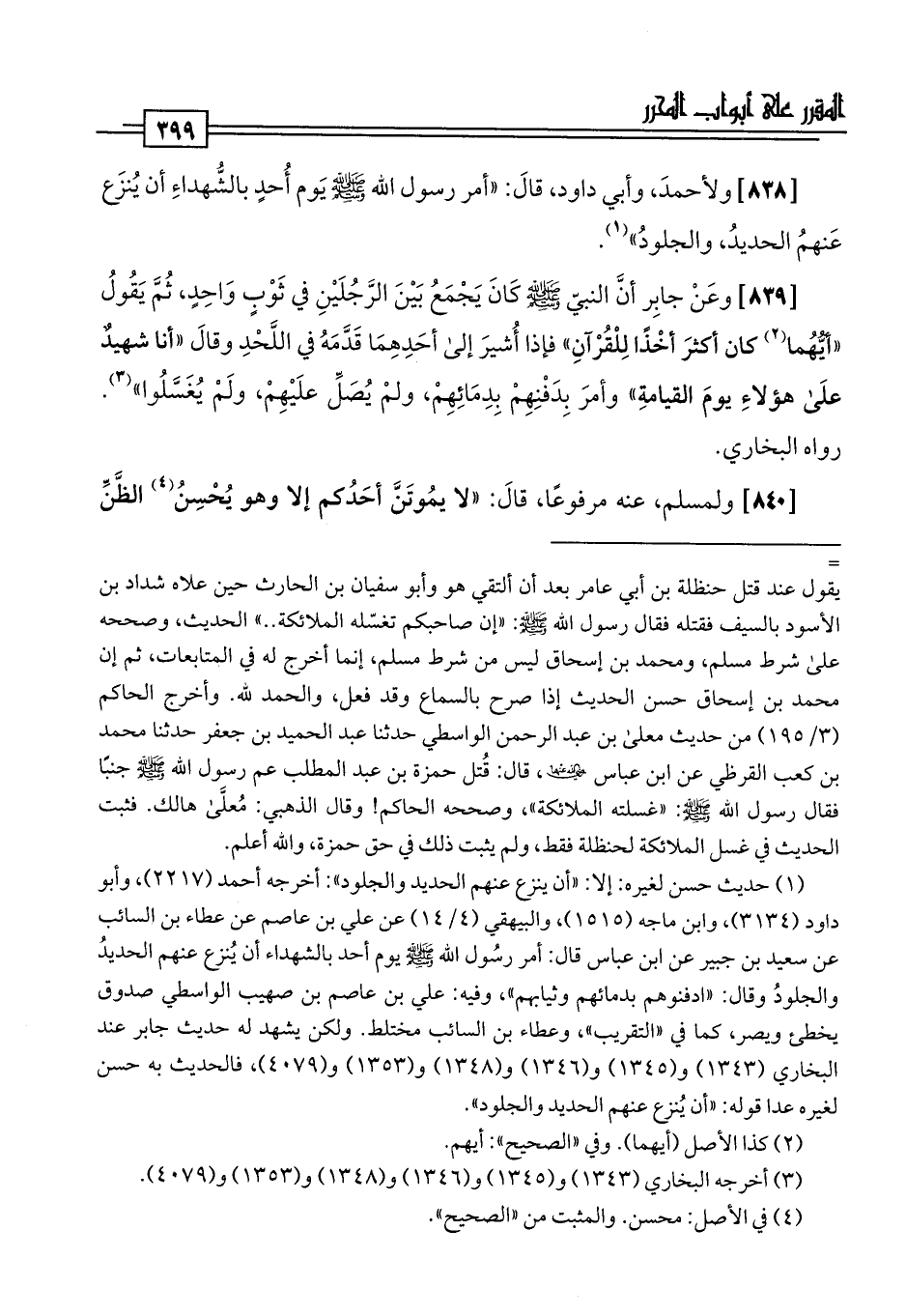 [838] ولأحمدَ، وأبي داود، قَالَ: "أمر رسول اللَّه -صلى اللَّه عليه وسلم- يَوم أُحدٍ بالشُّهداءِ أن يُنزَع عَنهمُ الحديدُ، والجلودُ" (¬1).