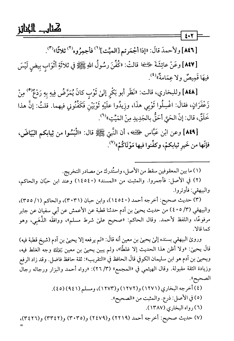[847] وعَنْ عائِشَةَ -رضي اللَّه عنها- قالتْ: "كُفِّنَ رسُولُ اللَّهِ -صلى اللَّه عليه وسلم- في ثلاثَةِ أثْوَابٍ بِيضٍ لَيْسَ فيهَا قَمِيصٌ ولا عِمَامةٌ" (¬4).