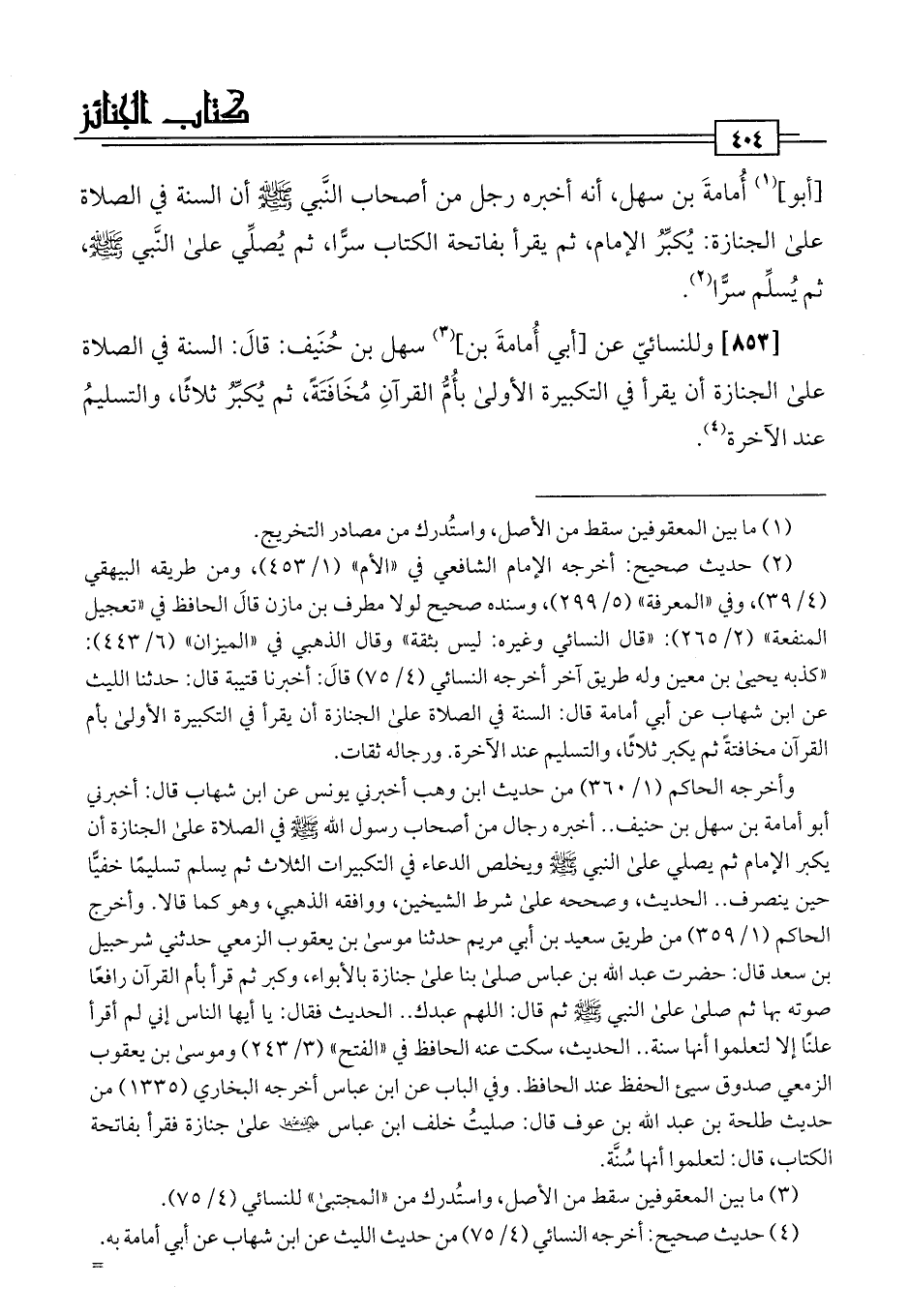 [853] وللنسائيّ عن [أبي أُمامةَ بن] (¬3) سهل بن حُنَيف: قَالَ: السنة في الصلاة على الجنازة أن يقرأ في التكبيرة الأولى بأُمُّ القرآنِ مُخَافَتَةً، ثم يُكبِّرُ ثلاثًا، والتسليمُ عند الآخرة (¬4).