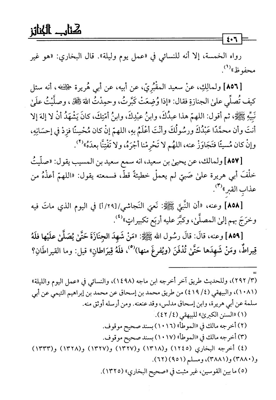 [856] ولمالِكِ، عنْ سعيد المقْبُرِيّ، عن أبيه، عن أبي هُريرة -رضي اللَّه عنه-، أنه سئل كيف تُصلِّي على الجنازةِ فقال: "إذا وُضِعَتْ كَبَّرتُ، وحمِدْتُ اللَّهَ عز وجل، وصلَّيْتُ علَى نَبِيِّهِ -صلى اللَّه عليه وسلم-، ثم أقول: اللهمّ هذا عبدُكَ، وابنُ عبْدِكَ، وابنُ أمّتِكَ، كَانَ يَشْهَدُ أنْ لا إلهَ إلا أنتَ وأن محمَّدًا عَبْدُكَ ورسُولُكَ وأنْتَ أعْلَمُ بهِ، اللهمّ إنْ كان مُحْسِنًا فزِدْ في إحسَانِهِ، وإنْ كان مُسيئًا فتَجَاوَزْ عنه، اللهُم لا تَحْرِمْنا أجْرَهُ، ولا تَفْتِنَّا بعدَهُ" (¬2).