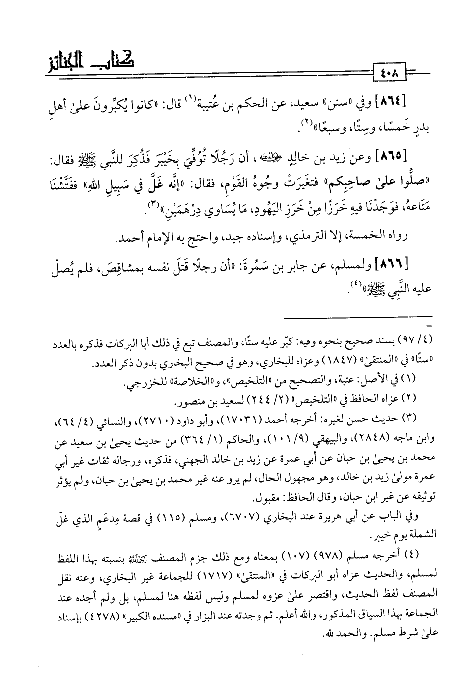 [864] وفي "سنن" سعيد، عن الحكم بن عُتيبة (¬1) قال: "كانوا يُكبِّرونَ على أهلِ بدرٍ خَمسًا، وسِتًا، وسبعًا" (¬2).
