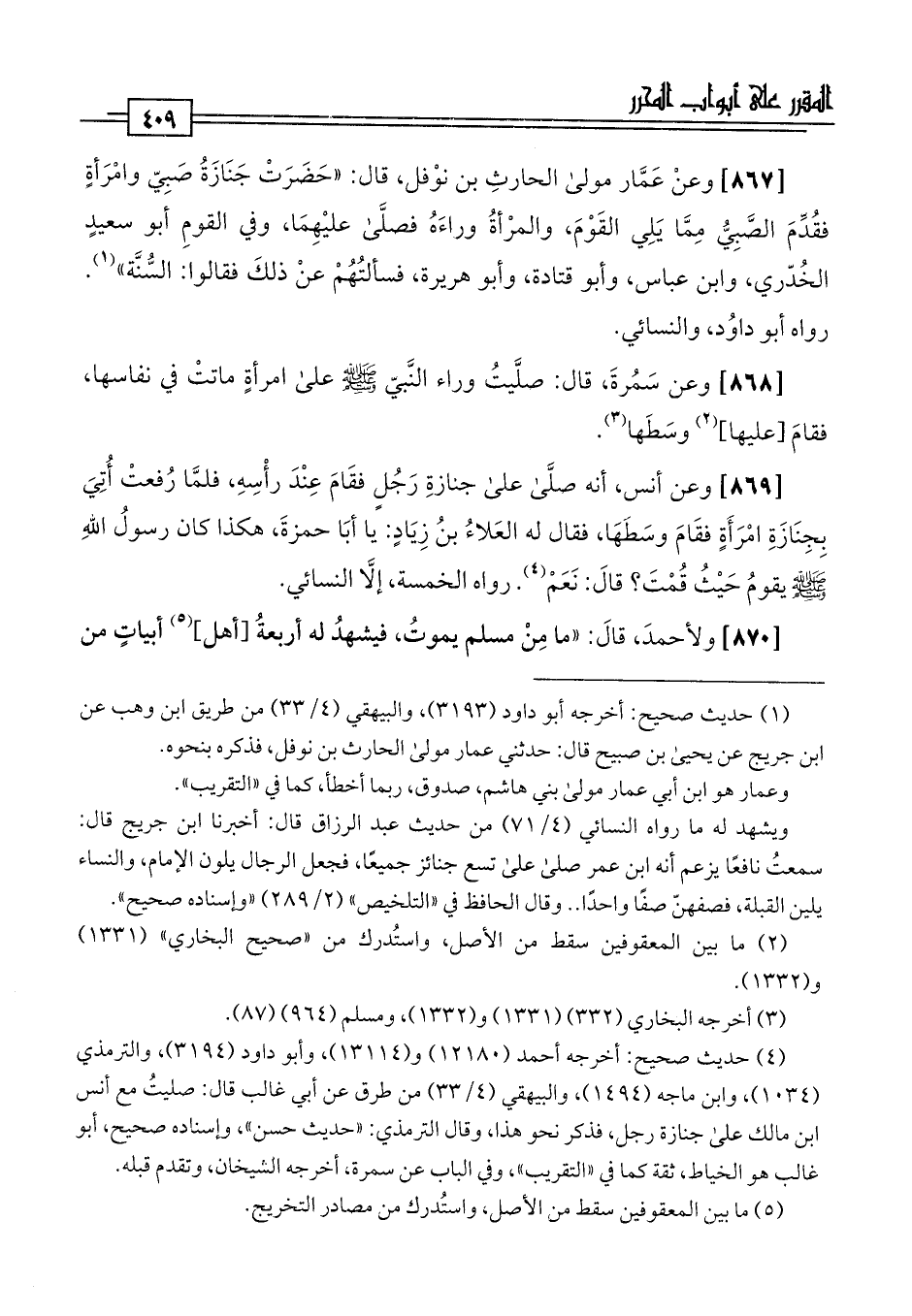 [869] وعن أنس، أنه صلَّى على جنازةِ رَجُلٍ فقَامَ عِنْدَ رأْسِهِ، فلمَّا رُفعتْ أُتِيَ بِجِنَازَةِ امْرَأَةٍ فقَامَ وسَطَهَا، فقال له العَلاءُ بنُ زِيَادٍ: يا أبَا حمزةَ، هكذا كان رسولُ اللَّهِ -صلى اللَّه عليه وسلم- يقومُ حَيْثُ قُمْتَ؟ قَالَ: نَعَمْ (¬4). رواه الخمسة، إلَّا النسائي.