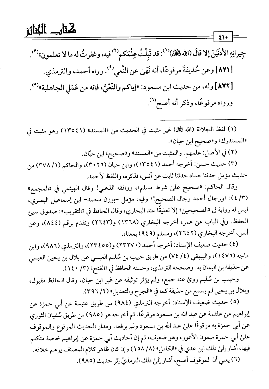 [871] وعن حُذيفةَ مرفوعًا، أنه نَهَى عن النَّعي (¬4). رواه أحمد، والترمذي.
