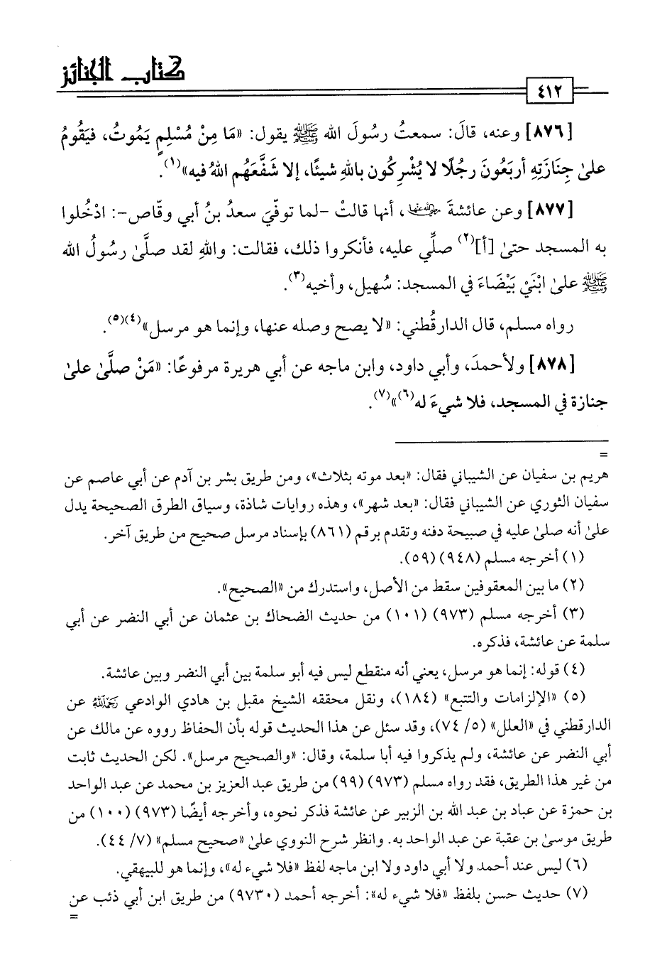 [878] ولأحمدَ، وأبي داود، وابن ماجه عن أبي هريرة مرفوعًا: "مَنْ صلَّى على جنازة في المسجد، فلا شيءَ له (¬6) " (¬7).