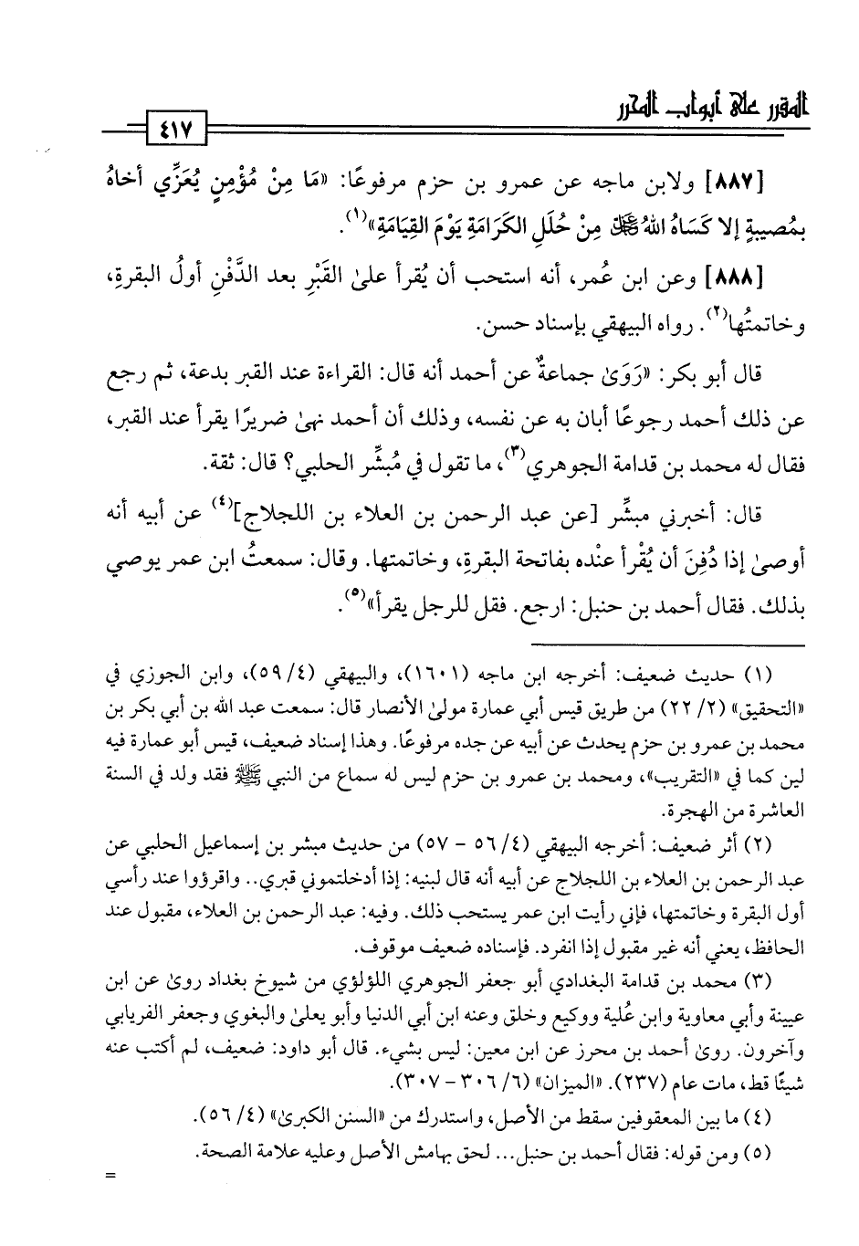 [888] وعن ابن عُمر، أنه استحب أن يُقرأ على القَبْرِ بعد الدَّفْنِ أولُ البقرةِ، وخاتمتُها (¬2). رواه البيهقي بإسناد حسن.