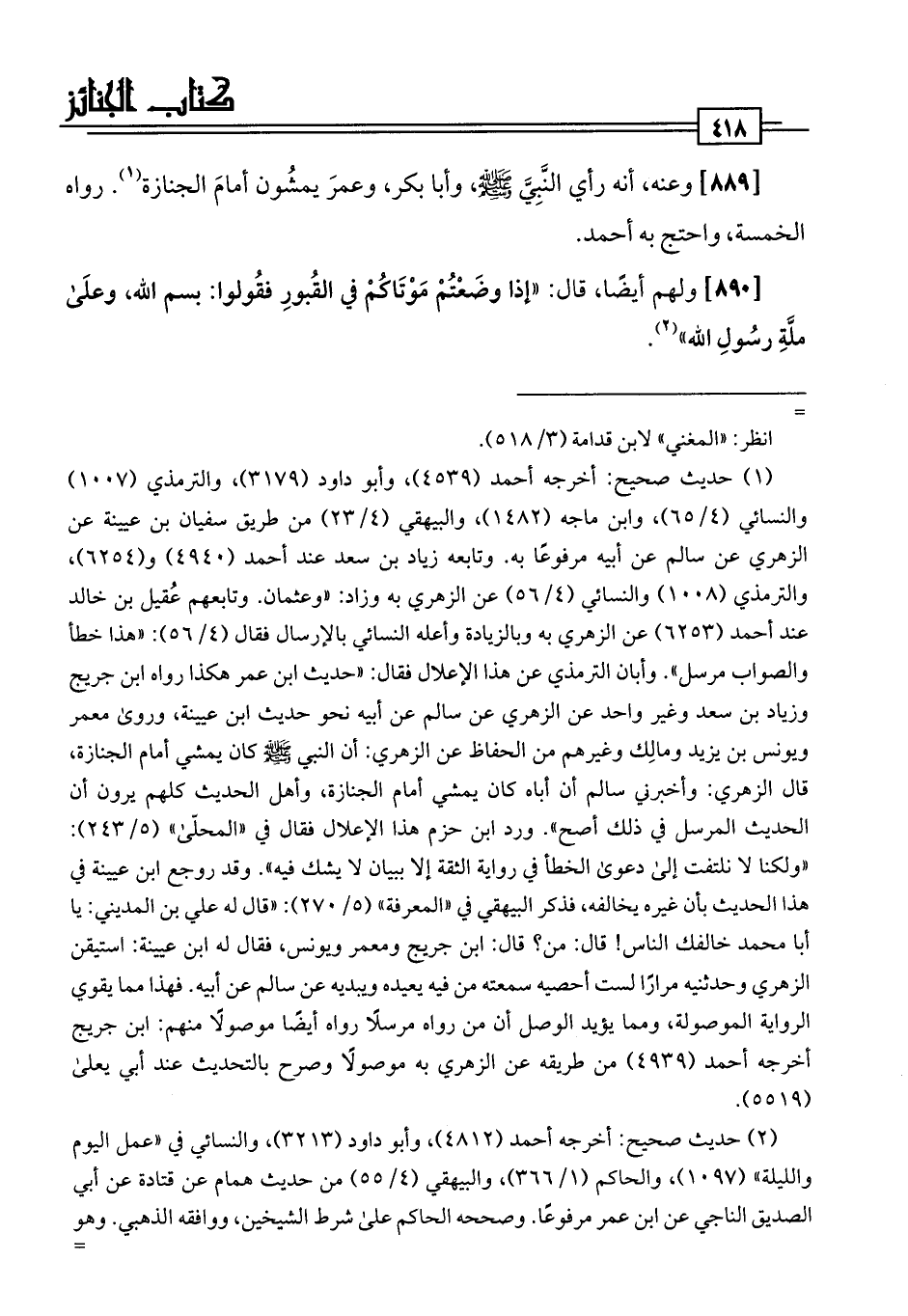 [889] وعنه، أنه رأي النَّبِيَّ -صلى اللَّه عليه وسلم-، وأبا بكر، وعمرَ يمشُون أمامَ الجنازة (¬1). رواه الخمسة، واحتج به أحمد.