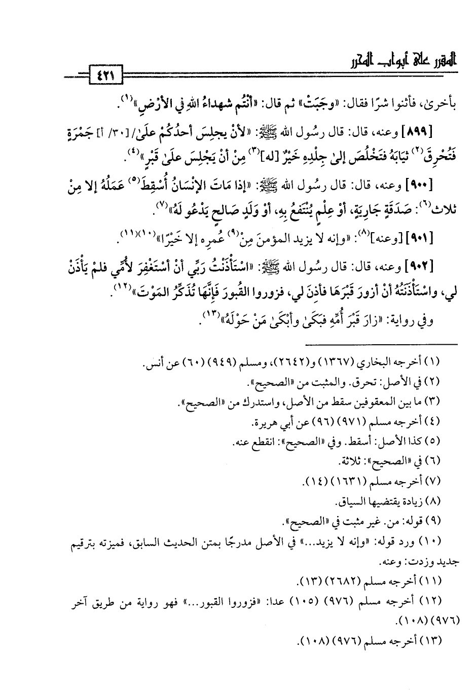 [902] وعنه، قال: قال رسُول اللَّه -صلى اللَّه عليه وسلم-: "اسْتَأْذَنْتُ رَبِّي أنْ أسْتَغْفِرَ لأُمِّي فلمْ يَأْذَنْ لي، واسْتَأْذَنَتُهُ أنْ أزورَ قَبْرَهَا فأذِنَ لي، فزوروا القُبورَ فَإِنَّهَا تُذَكِّرُ المَوْتَ" (¬12).