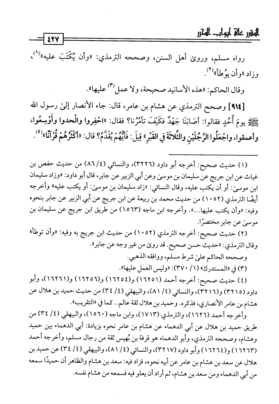 [914] وصحح الترمذي عن هشام بن عامر، قال: جاء الأنصار إلى رسول اللَّه -صلى اللَّه عليه وسلم- يومَ أُحُدٍ فقالوا: أصَابَنَا جَهْدٌ فكَيْفَ تأمُرُنا؟ فقال: "احْفِروا والْحدوا وأَوْسِعُوا، وأعمقوا، واجْعَلُوا الرَّجُلَيْنِ والثَّلاثَةَ في القَبْرِ" قِيلَ: فَأيُّهُمْ يُقَدَّمُ؟ قال: "أكْثَرُهُمْ قُرْآنًا" (¬4).