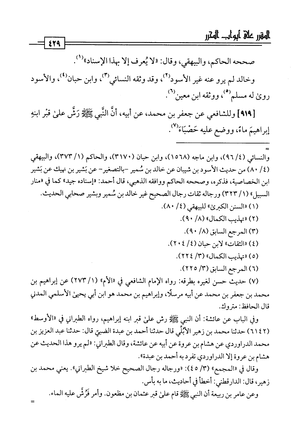 [919] وللشافعي عن جعفر بن محمد، عن أبيه، أنَّ النَّبي -صلى اللَّه عليه وسلم- رَشَّ على قبْر ابنهِ إبراهيمَ ماءً، ووضع عليه حَصْبَاءَ (¬7).