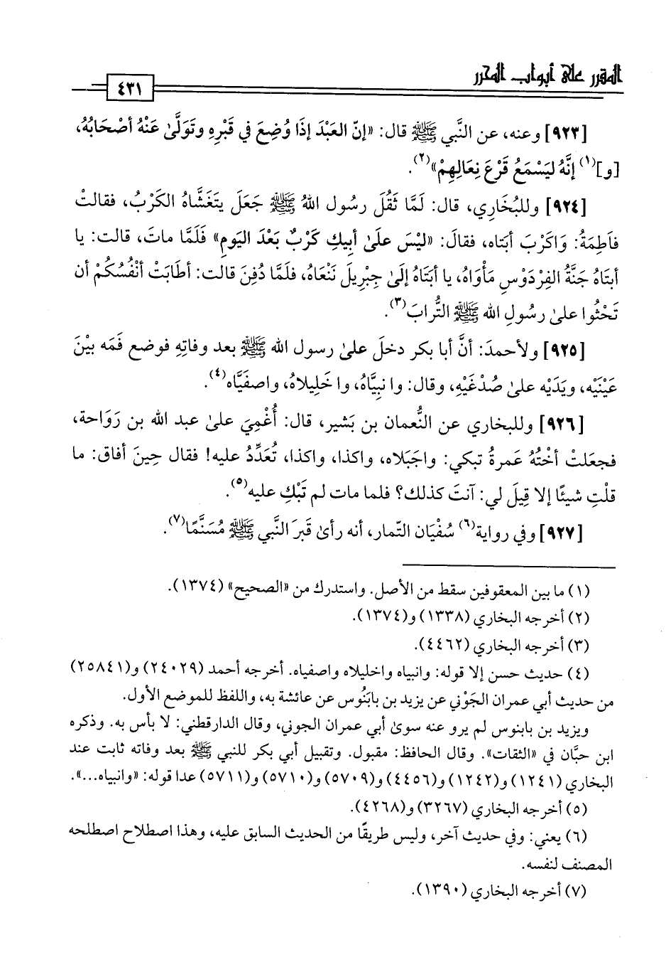 [925] ولأحمدَ: أنَّ أبا بكر دخلَ على رسول اللَّه -صلى اللَّه عليه وسلم- بعد وفاتِهِ فوضع فَمَه بيْنَ عَيْنَيْه، ويَدَيْه على صُدْغَيْهِ، وقال: وانبِيَّاهُ، واخَلِيلاهُ، واصفَيَّاه (¬4).