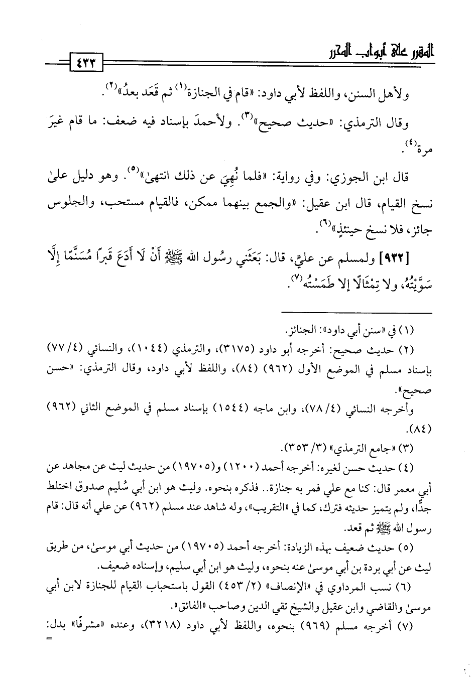 [932] ولمسلم عن عليٍّ، قال: بَعَثَني رسُول اللَّه -صلى اللَّه عليه وسلم- أَنْ لَا أَدَعَ قَبرًا مُسَنَّمًا إِلَّا سَوَّيْتُهُ، ولا تِمْثَالًا إلا طَمَسْتُه (¬7).