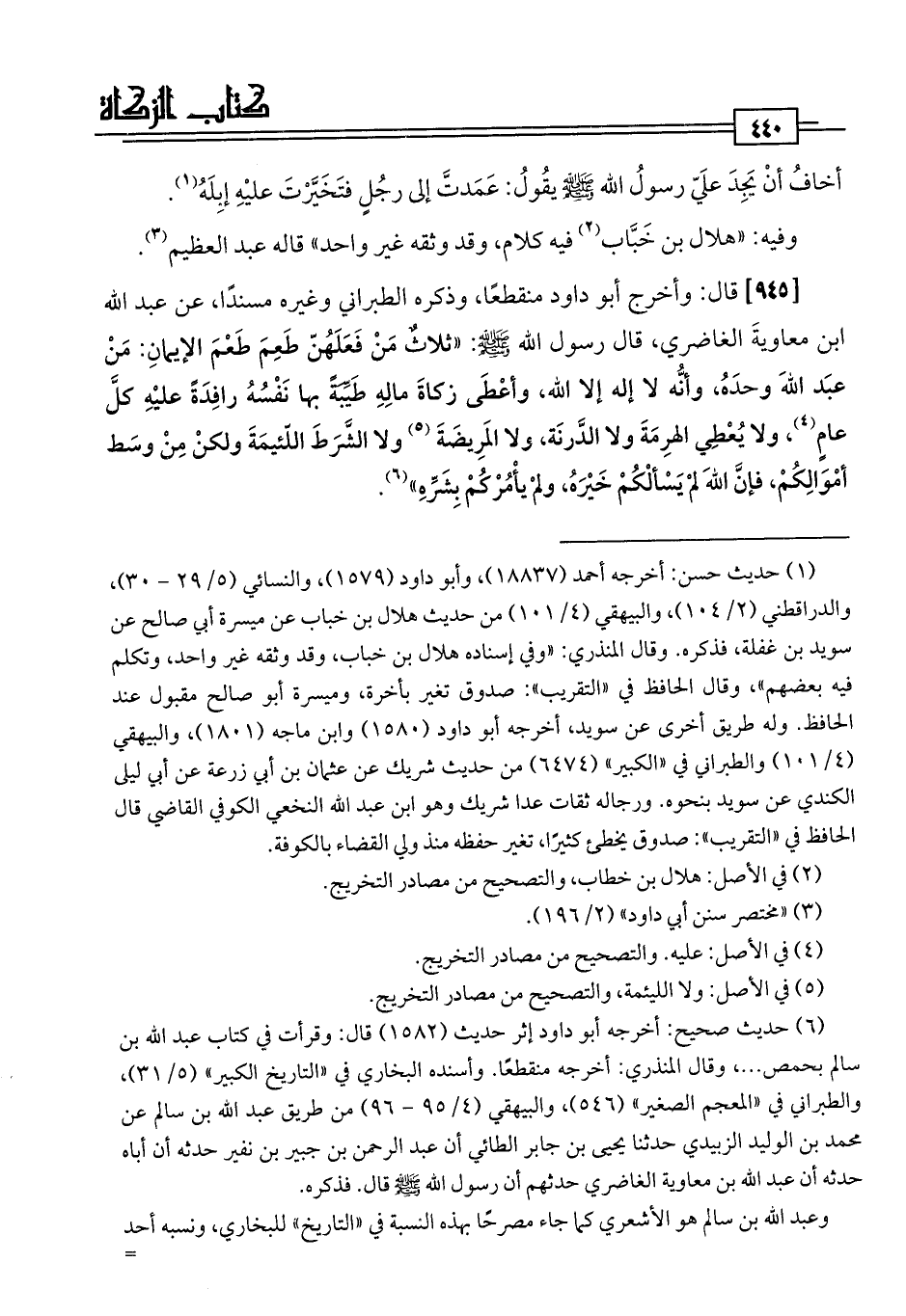 [945] قال: وأخرج أبو داود منقطعًا، وذكره الطبراني وغيره مسندًا، عن عبد اللَّه ابن معاويةَ الغاضري، قال رسول اللَّه -صلى اللَّه عليه وسلم-: "ثلاثٌ مَنْ فَعَلَهُنّ طَعِمَ طَعْمَ الإيمانِ: مَنْ عبَد اللَّهَ وحدَهُ، وأنّه لا إله إلا اللَّه، وأعْطَى زكاةَ مالِهِ طَيِّبَةً بها نَفْسُهُ رافِدَةً عليْهِ كلَّ عامٍ (¬4)، ولا يُعْطِي الهرِمَةَ ولا الدَّرنَة، ولا المَرِيضَةَ (¬5) ولا الشَّرَطَ اللّئيمَةَ ولكنْ مِنْ وسَط أمْوَالِكُمْ، فإنَّ اللَّهَ لمْ يَسْألْكُمْ خَيْرَهُ، ولمْ يأْمُرْكُمْ بِشَرِّهِ" (¬6).