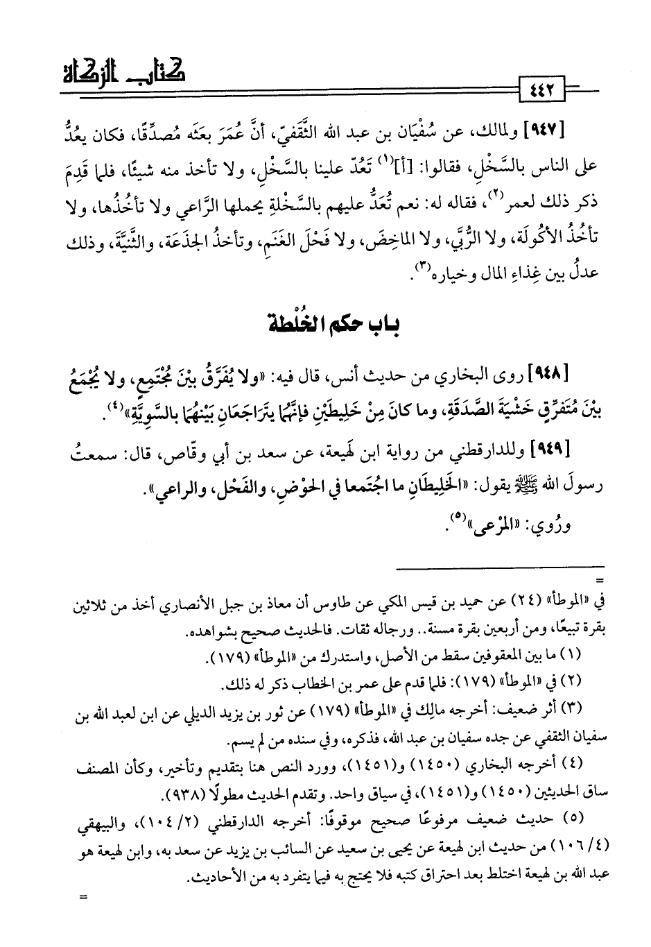 [948] روى البخاري من حديث أنس، قال فيه: "ولا يُفَرَّقُ بيْنَ مُجْتَمِعٍ، ولا يُجْمَعُ بيْنَ مُتَفرِّقٍ خَشْيَةَ الصَّدَقَةِ، وما كَانَ مِنْ خَلِيطَيْنِ فإنَّهُما يتَرَاجَعَانِ بَيْنهُمَا بالسَّوِيَّةِ" (¬4).