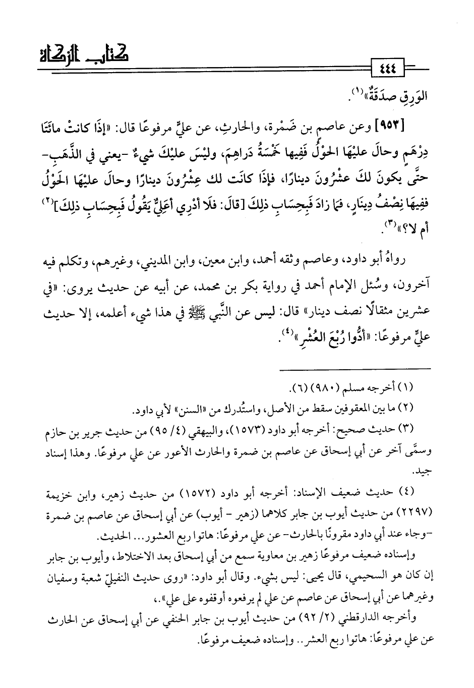 [953] وعن عاصمٍ بن ضَمْرة، والحارثِ، عن عليٍّ مرفوعًا قال: "إذَا كانتْ مائَتَا دِرْهَمٍ وحالَ عليْهَا الحوْلُ فَفِيها خَمْسَةُ دَراهِمَ، وليْسَ عليْكَ شيءٌ -يعني في الذَّهَبِ- حتَّى يكونَ لكَ عشْرُونَ دينارًا، فإذَا كانَت لك عِشْرُونَ دينارًا وحالَ عليْهَا الحَوْلُ ففِيهَا نِصْفُ دِينَارٍ، فمَا زادَ فَبِحِسَابِ ذلِكَ [قَالَ: فلَا أدْرِي أعَليٌّ يَقُولُ فَبِحِسَابِ ذلِكَ] (¬2) أم لا؟ " (¬3).