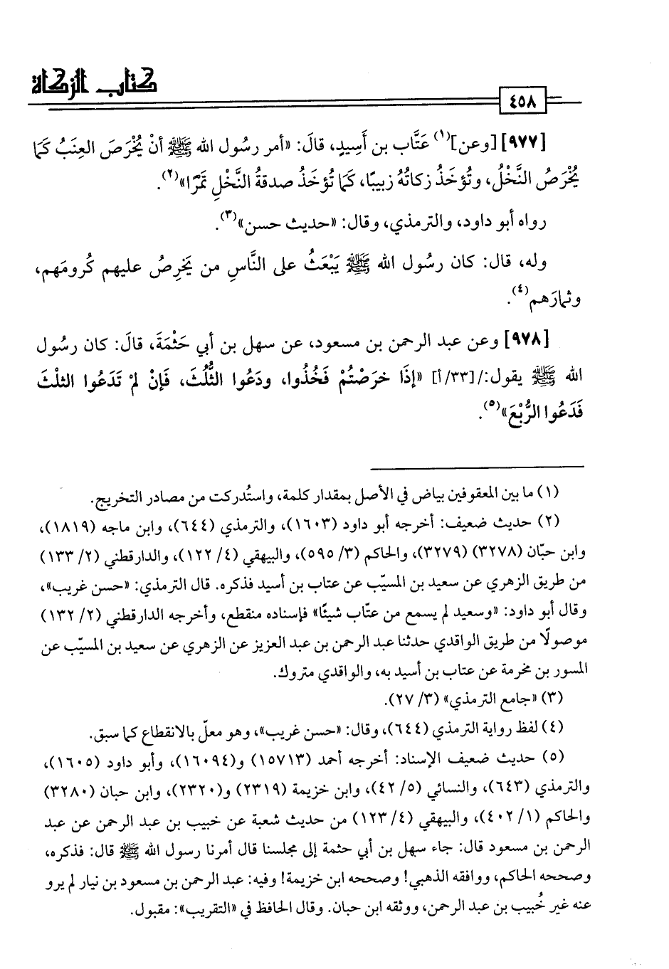 [977] [وعن] (¬1) عَتَّاب بن أَسِيدٍ، قَالَ: "أمر رسُول اللَّه -صلى اللَّه عليه وسلم- أنْ يُخْرَصَ العِنَبُ كَمَا يُخْرَصُ النَّخْلُ، وتُؤخَذُ زكاتُهُ زبيبًا، كَمَا تُؤخَذُ صدقةُ النَّخْلِ تَمْرًا" (¬2).
