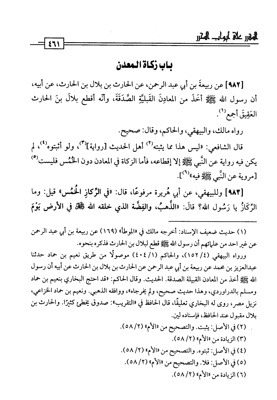 [982] عن ربيعةَ بن أبي عبد الرحمن، عن الحارث بن بلال بن الحارث، عن أبيه، أن رسول اللَّه -صلى اللَّه عليه وسلم- أخَذَ من المعادِنَ القَبليَّةِ الصَّدَقَةَ، وأنه أقطع بلالَ بنَ الحارث العَقِيقَ أجمع (¬1).