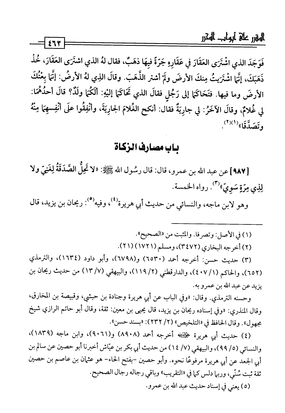 [987] عن عبد اللَّه بن عمرو، قال: قال رسُول اللَّه -صلى اللَّه عليه وسلم-: "لا تَحِلُّ الصَّدَقَةُ لِغَنيّ ولا لِذِي مِرّةٍ سَوِيّ" (¬3). رواه الخمسة.