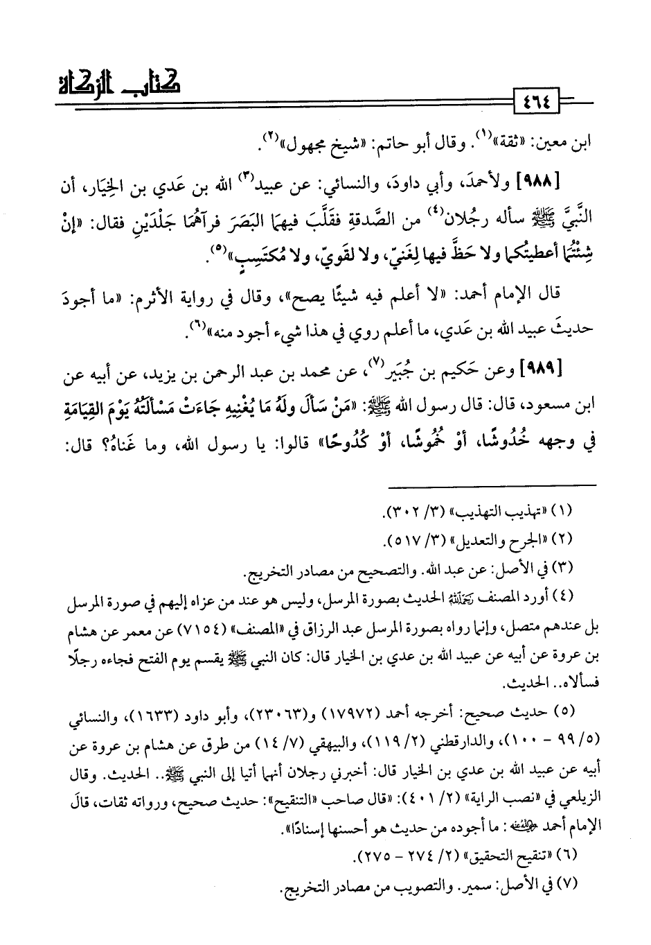 [989] وعن حَكيم بن جُبَير (¬7)، عن محمد بن عبد الرحمن بن يزيد، عن أبيه عن ابن مسعود، قال: قال رسول اللَّه -صلى اللَّه عليه وسلم-: "مَنْ سَألَ ولَهُ مَا يُغْنِيهِ جَاءَتْ مَسْألَتُهُ يَوْمَ القِيَامَةِ في وجهه خُدُوشًا، أَوْ خُمُوشًا، أَوْ كُدُوحًا" قالوا: يا رسول اللَّه، وما غَناهُ؟ قال: