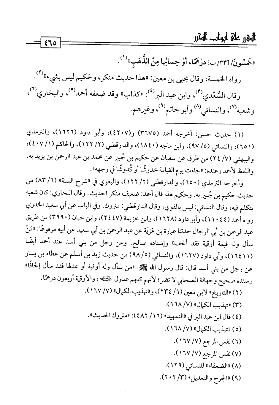 رواه الخمسة، وقال يحيى بن معين: "هذا حديث منكر، وحَكيم ليس بشيء" (¬2).