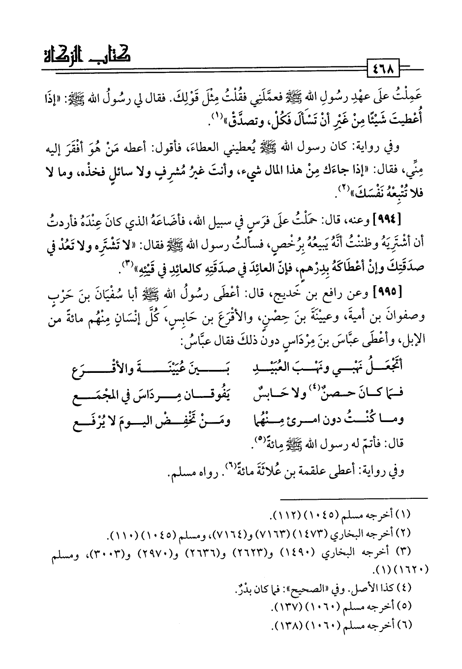[995] وعن رافع بن خَديج، قال: أعْطَى رسُولُ اللَّه -صلى اللَّه عليه وسلم- أبا سُفْيَانَ بنَ حَرْبٍ وصفوانَ بن أميةَ، وعييْنَةَ بنَ حِصْنٍ، والأقْرَعَ بن حَابِسٍ، كُلَّ إنْسَانٍ مِنْهُم مائةً من الإبل، وأعْطَى عبَّاسَ بنَ مِرْدَاسٍ دون ذلكَ فقال عبَّاسُ: