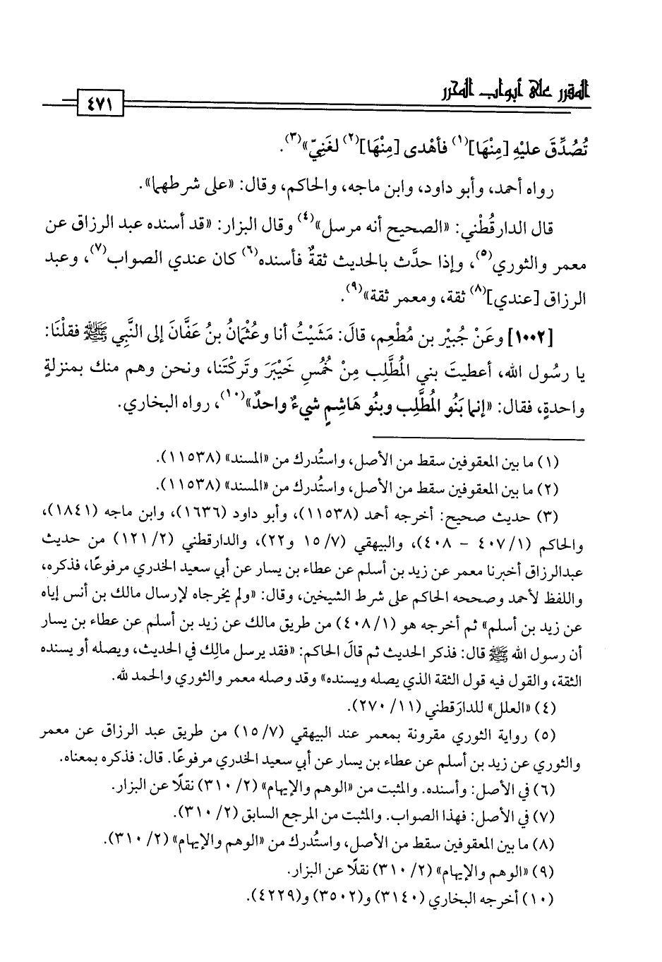[1002] وعَنْ جُبيْر بن مُطْعِم، قَالَ: مَشَيْتُ أنا وعُثْمَانُ بنُ عَفَّانَ إلى النَّبِي -صلى اللَّه عليه وسلم- فقلْنَا: يا رسُول اللَّه، أعطيتَ بني المُطَّلِب مِنْ خُمُسِ خَيْبَرَ وتَركْتَنا، ونحن وهم منك بمنزلة واحدةٍ، فقال: "إنما بَنُو المُطَّلِب وبنُو هَاشِمٍ شيءٌ واحدٌ" (¬10)، رواه البخاري.