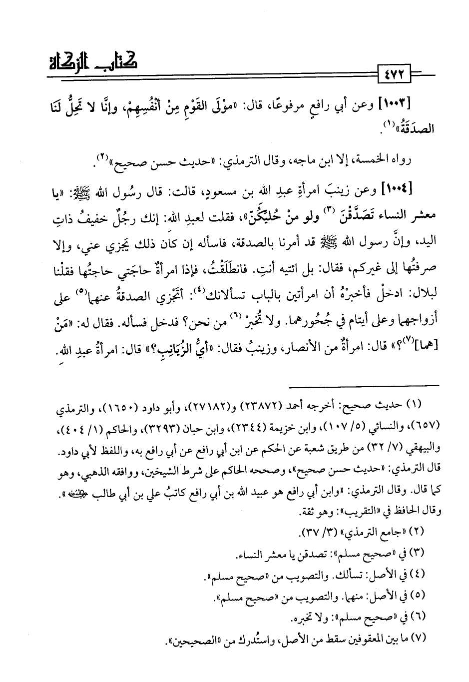 [1004] وعن زينب امرأةِ عبدِ اللَّه بن مسعودٍ، قالت: قال رسُول اللَّه -صلى اللَّه عليه وسلم-: "يا معشر النساء تَصَدَّقْنَ (¬3) ولو منْ حُليِّكُنّ"، فقلت لعبدِ اللَّه: إنك رجُلٌ خفيفُ ذاتِ اليد، وإنَّ رسول اللَّه -صلى اللَّه عليه وسلم- قد أمرنا بالصدقة، فاسأله إن كاَن ذلك يَجزي عني، وإلا صرفتُها إلى غيركم، فقال: بل ائتيه أنتِ. فانطَلَقْتُ، فإذا امرأةٌ حاجَتي حاجتُها فقلْنا لبلال: ادخلْ فأخبرْهُ أن امرأتين بالباب تسألانك (¬4): أتَجْزي الصدقةُ عنهما (¬5) على أزواجهما وعلى أيتام في جُحُورهما. ولا تُخبرْ (¬6) من نحن؟ فدخل فسأله. فقال له: "مَنْ [هما] (¬7)؟ " قال: امرأةٌ من الأنصار، وزينبُ فقال: "أيُّ الزُيَانبِ؟ " قال: امرأةُ عبدِ اللَّهِ.